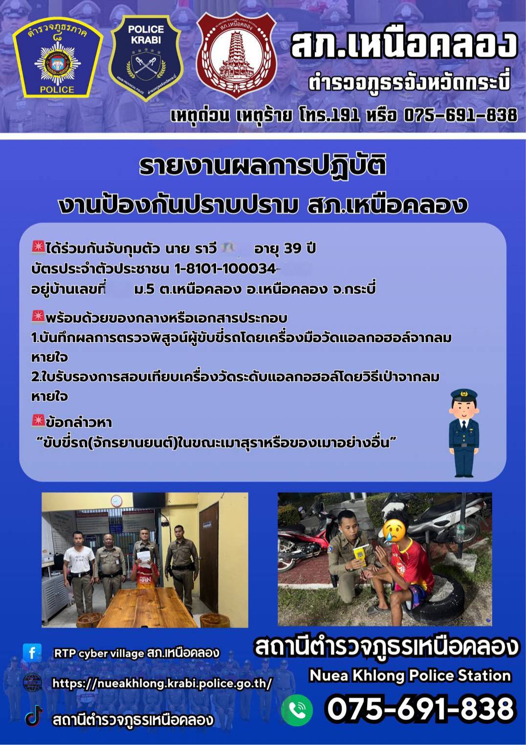 วันที่ 13 เมษายน 2568 ชุดสายตรวจรถยนต์ สภ.เหนือคลอง ได้จับกุม ผู้ต้องหาเมาแล้วขับ 2 ราย จึงนำส่งพนัก