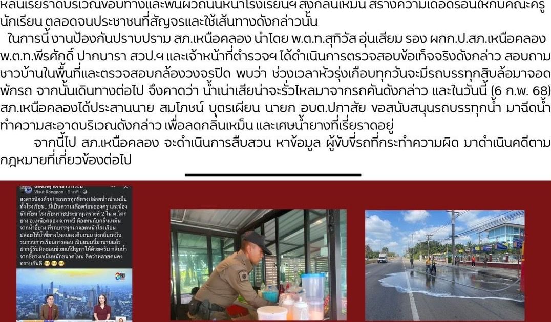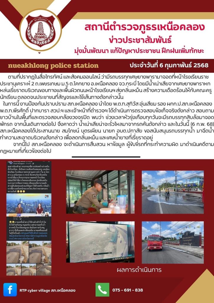 ตามที่ปรากฏใน สื่อโซเชียล เพจเพจบุ๊ค “แจ้งเหตุ แจ้งข่าว กระบี่” และข่าวทางสื่อโทรทัศน์และสื่อสังคมออนไลน์เมื่อช่วงเช้าของวันที่ 6 กุมภาพันธ์ 2568 ว่ามีรถบรรทุกเศษยางพารามาจอดที่หน้าโรงเรียนราชประชานุเคราะห์ 2 ถนนเพชรเกษม ม.5 ต.โคกยาง อ.เหนือคลอง จว.กระบี่ ทำให้น้ำเน่าจากเศษยางพาราตกหล่นเรี่ยราดบริเวณขอบทางหน้าโรงเรียนส่งกลิ่นเหม็นสร้างความเดือดร้อนให้กับคณะครูและนักเรียนตลอดจนประชาชนที่ผ่านเส้นทางดังกล่าว ในการนี้ ได้ประสานกับนายสมโภชน์ บุตรเผียน นายกองค์การบริหารส่วนตำบลปกาสัย ให้เจ้าหน้าที่พร้อมนำรถบรรทุกน้ำมาฉีดชะล้างความสกปรก และดับกลิ่นเหม็นที่บริเวณดังกล่าว
